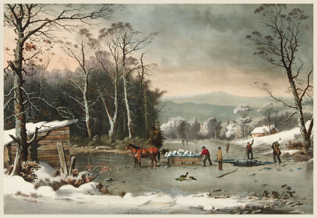 IN WINTER PEOPLE ARE CUTTING ICE FROM A FROZEN POND FOR SUMMER USE
