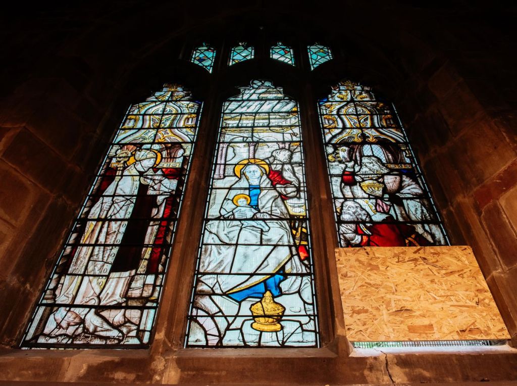 THREE STAINED-GLASS WINDOWS IN A GOTHIC CHURCH, ONE DAMAGED BY WAR